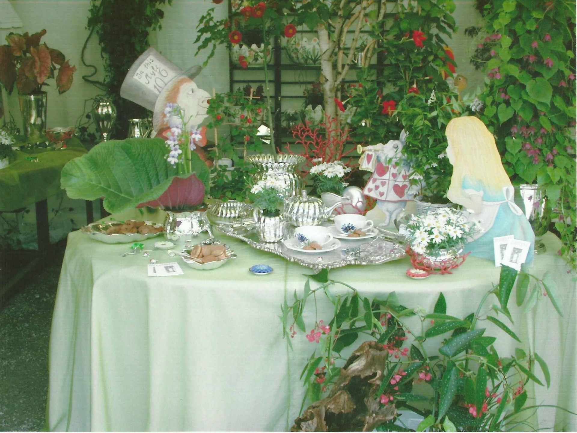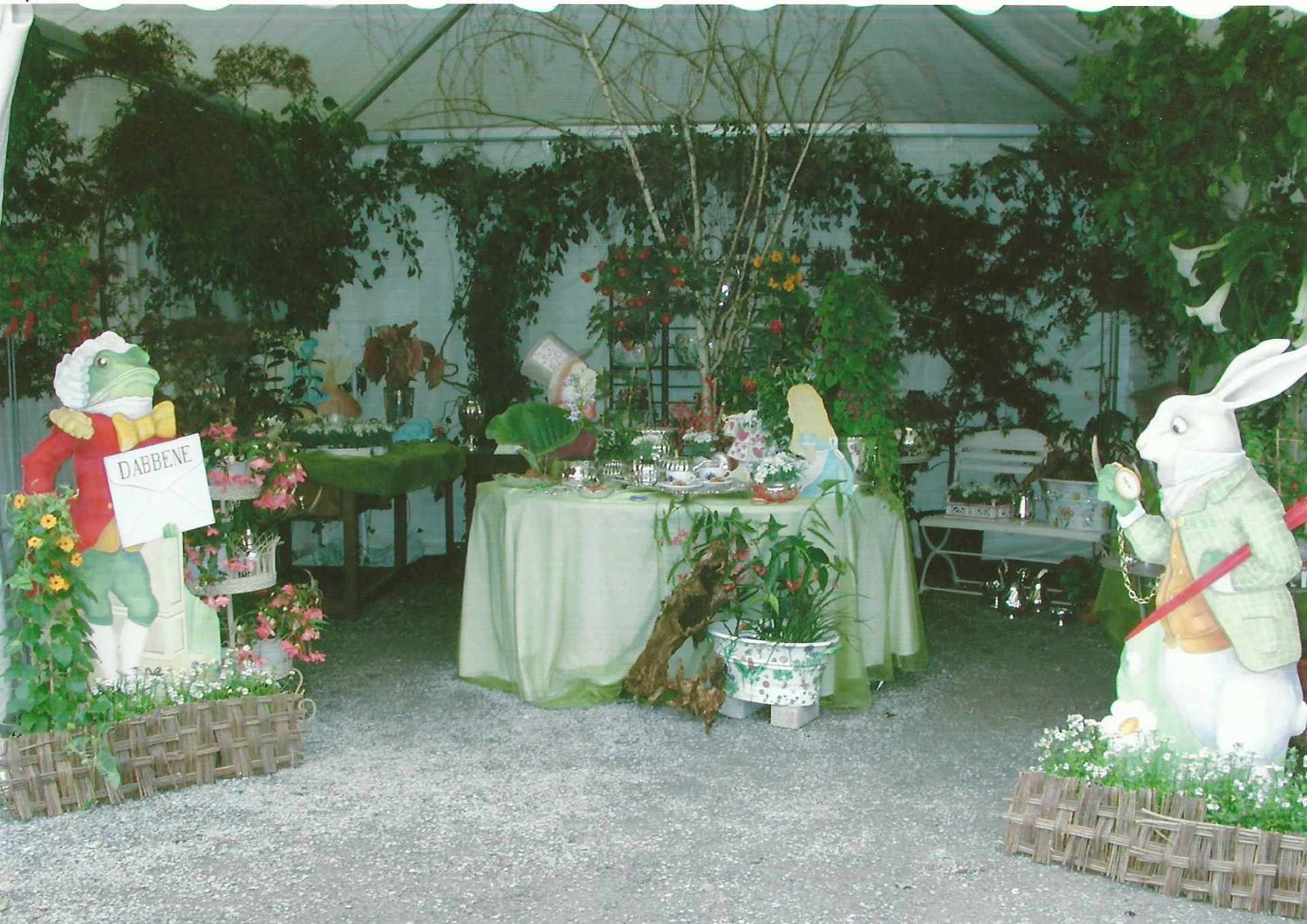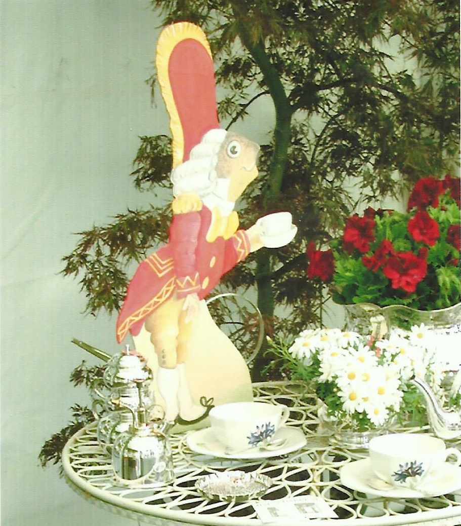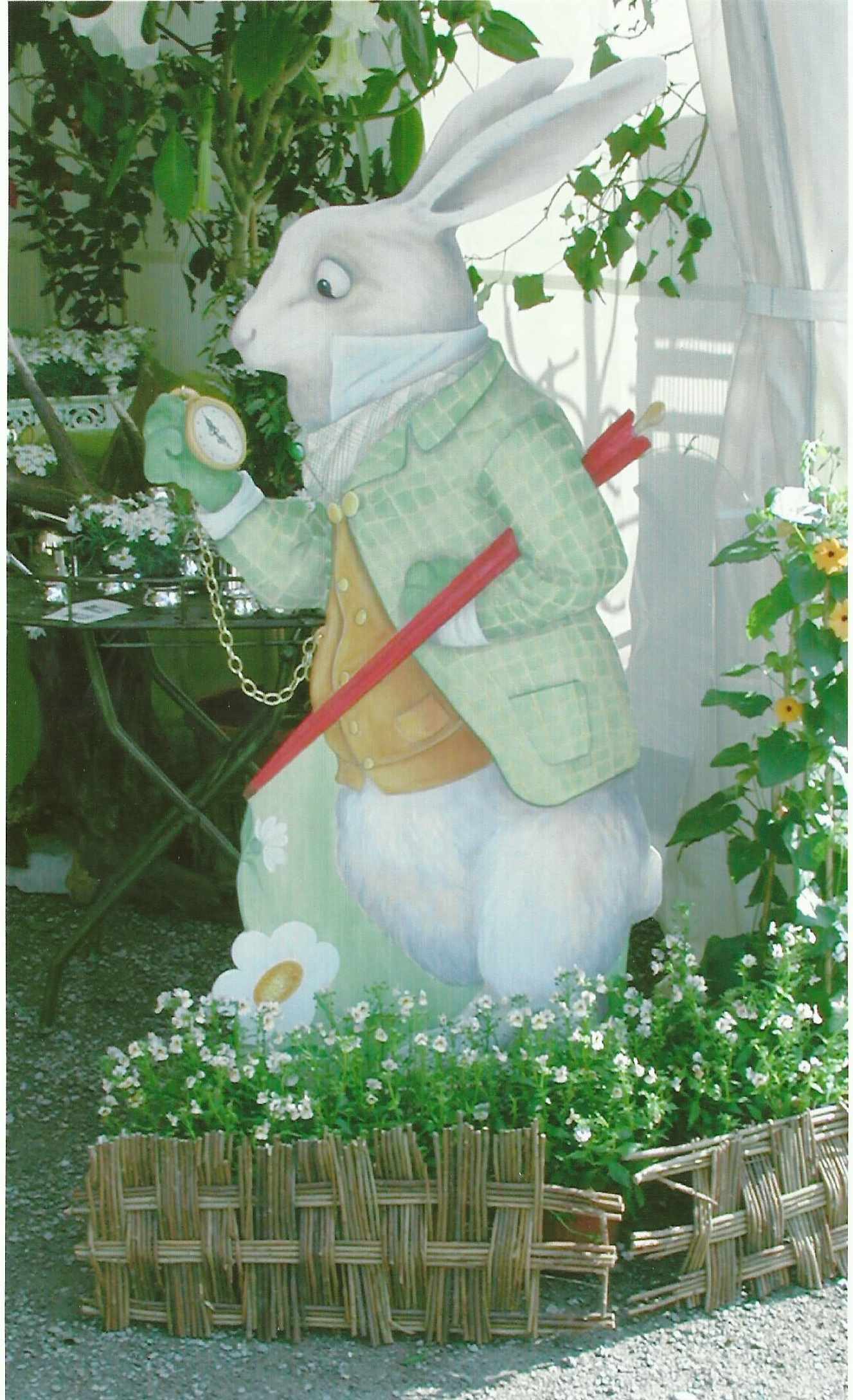 Sagome in legno tagliate e dipinte a mano fanno rivivere i personaggi di Alice nel paese delle meraviglie nello stand di Dabbene a Orticola 2004