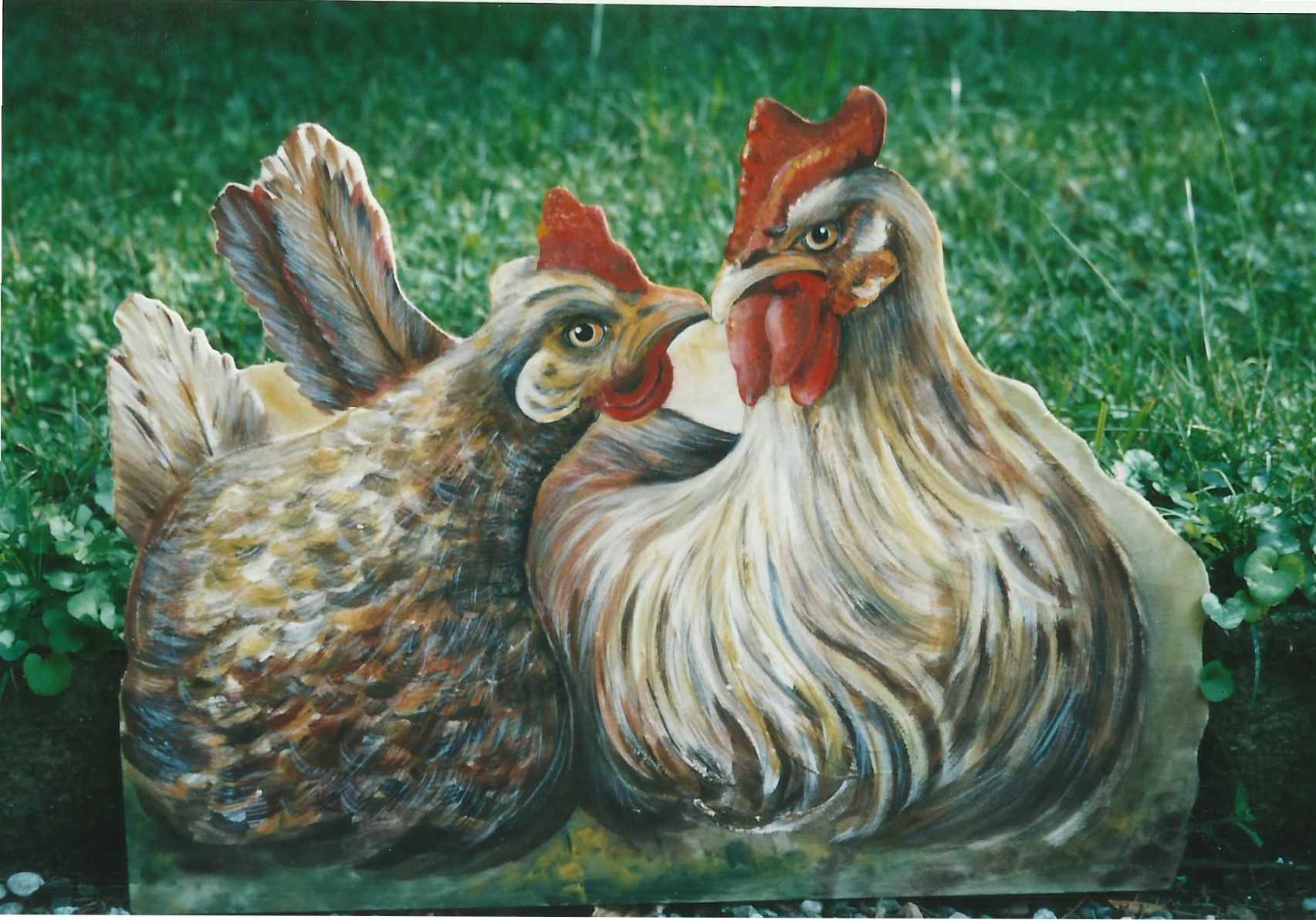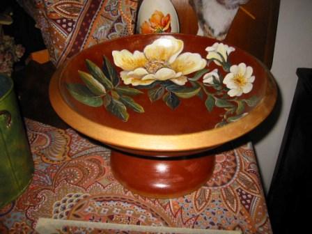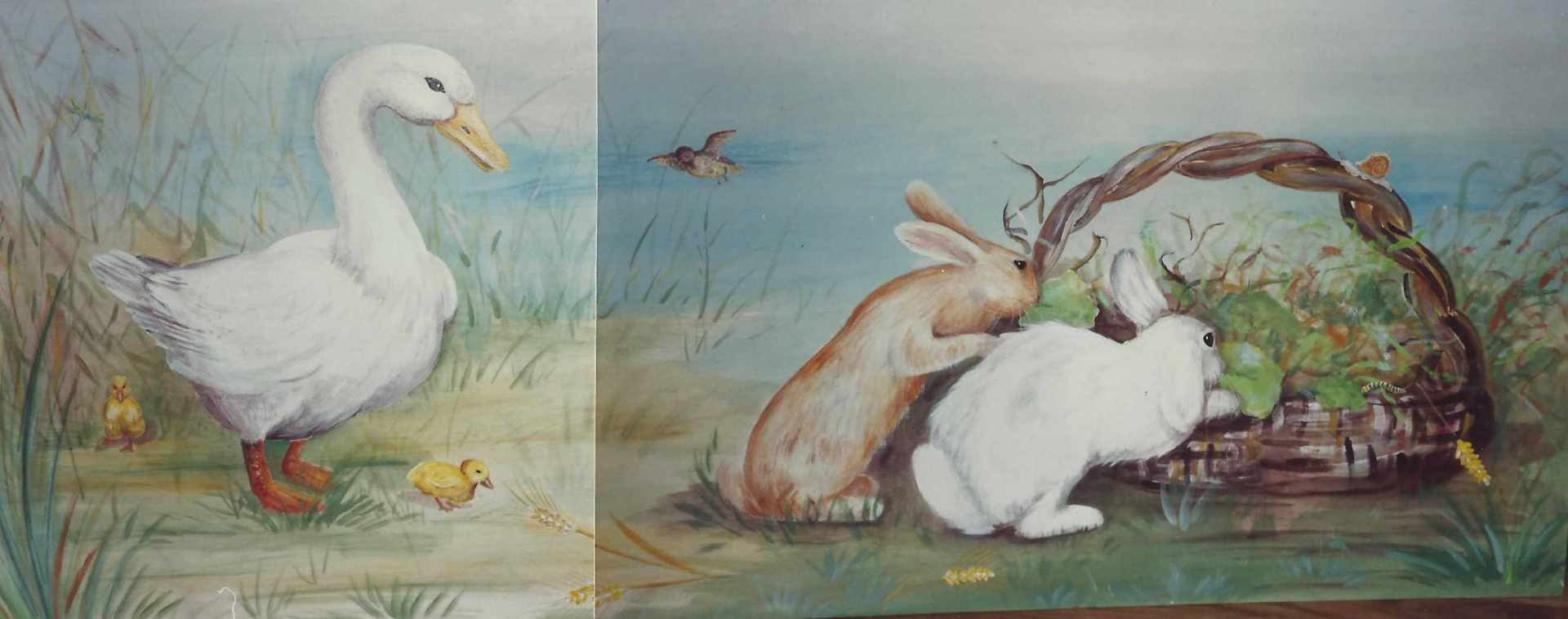 Cavalli e animali da caccia sono dipinti su vassoi e ciotole di legno. Una sagoma di legno di una volpe ci guarda incuriosita