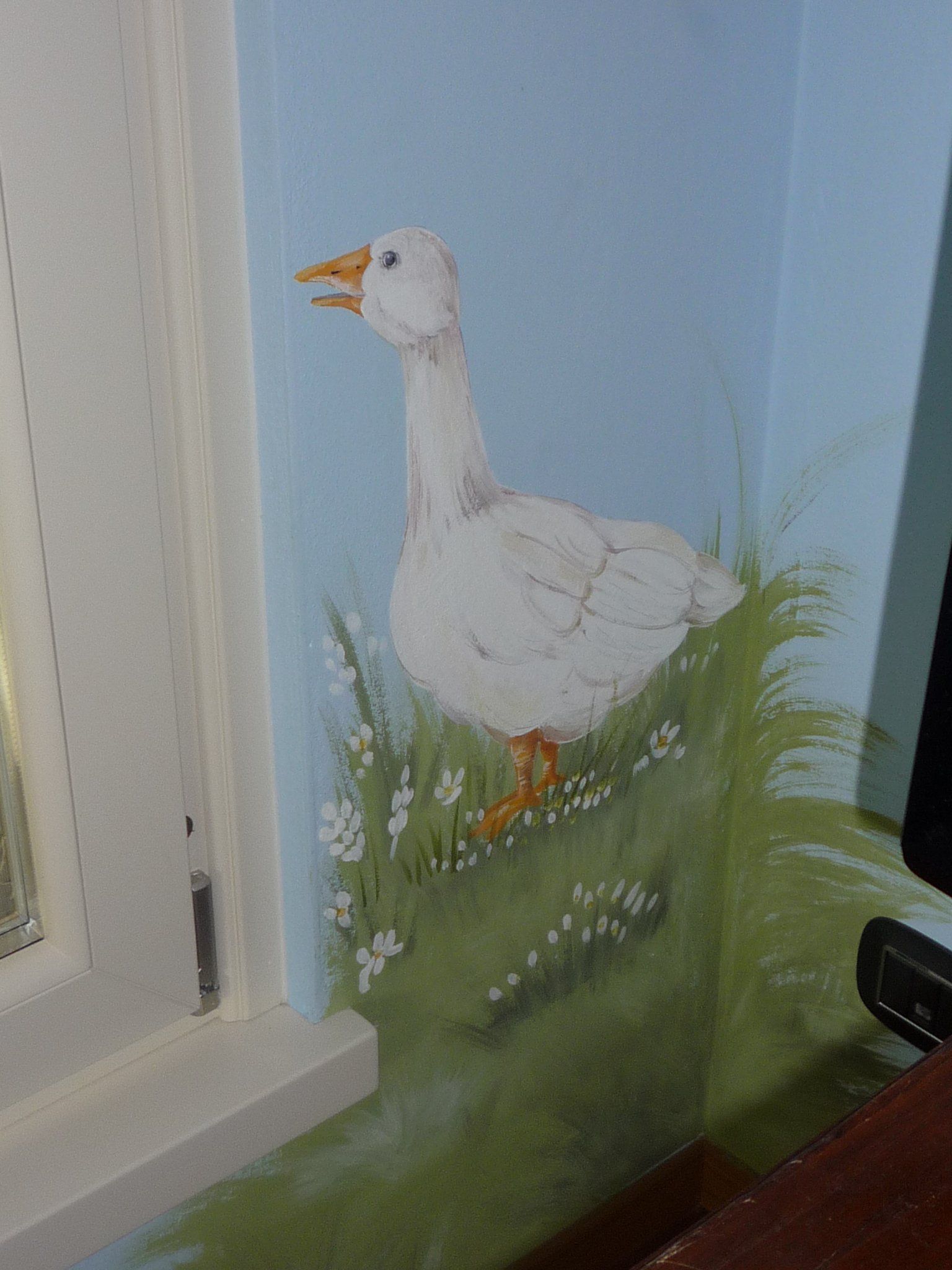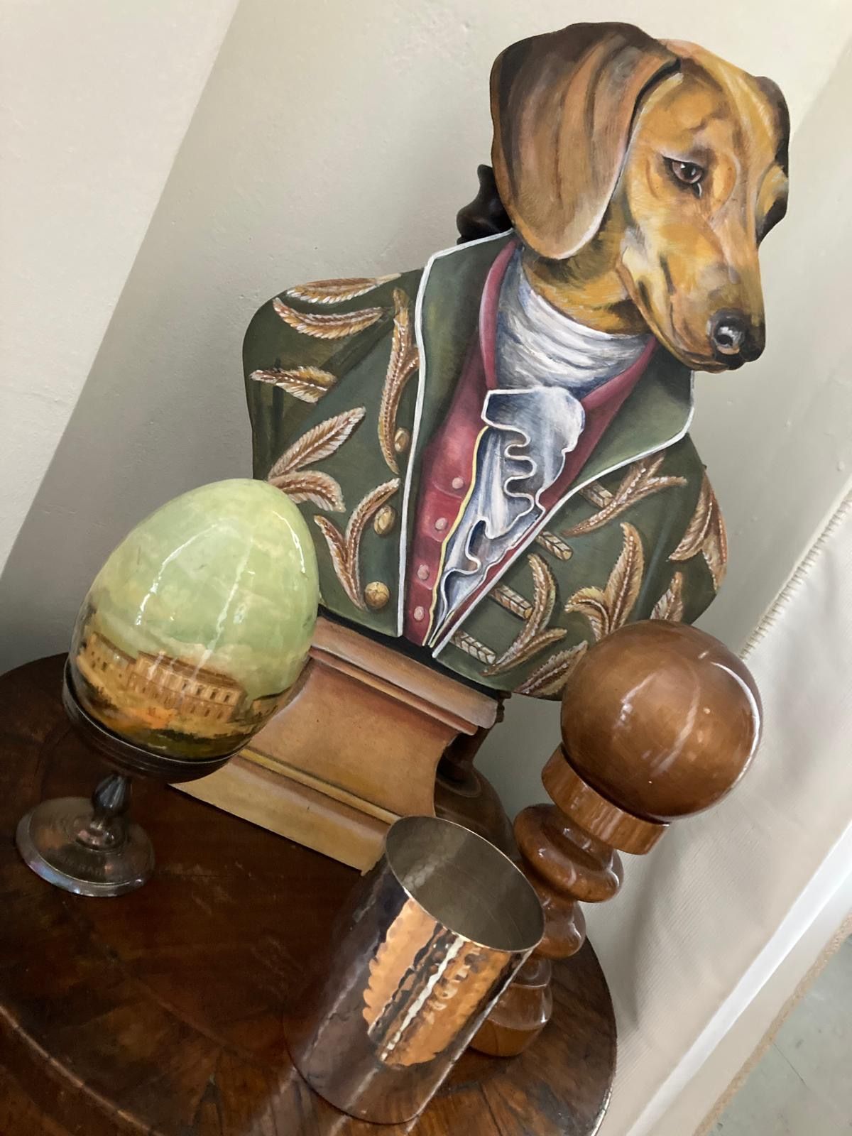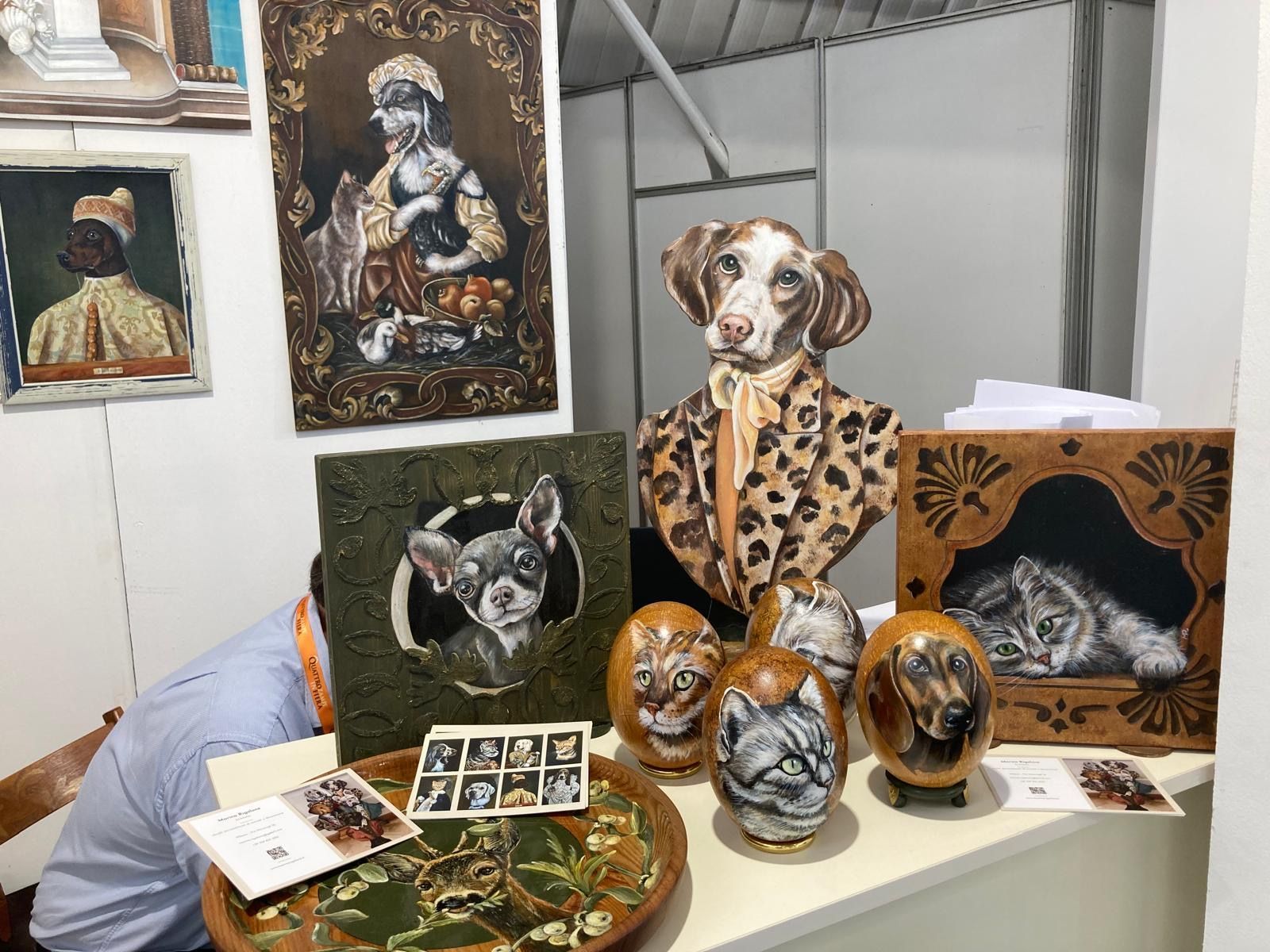 Cavalli e animali da caccia sono dipinti su vassoi e ciotole di legno. Una sagoma di legno di una volpe ci guarda incuriosita