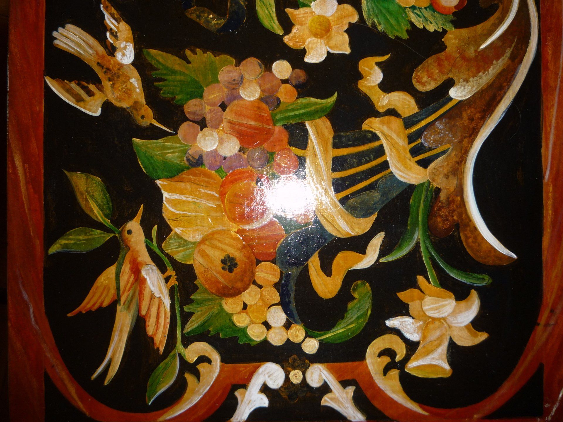 Su uova di legno tornito sono riportati dipinti di vari soggetti, da paesaggi di località note a natura morte.